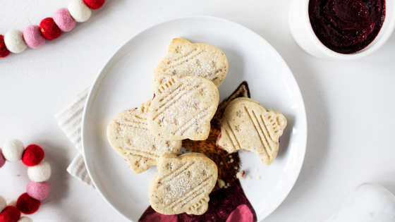 These buttery sandwich cookies are filled with organic cranberry sauce for a fruity twist on a holiday classic. They’re one of the prettiest (and tastiest) ways to use cranberry sauce in baking.