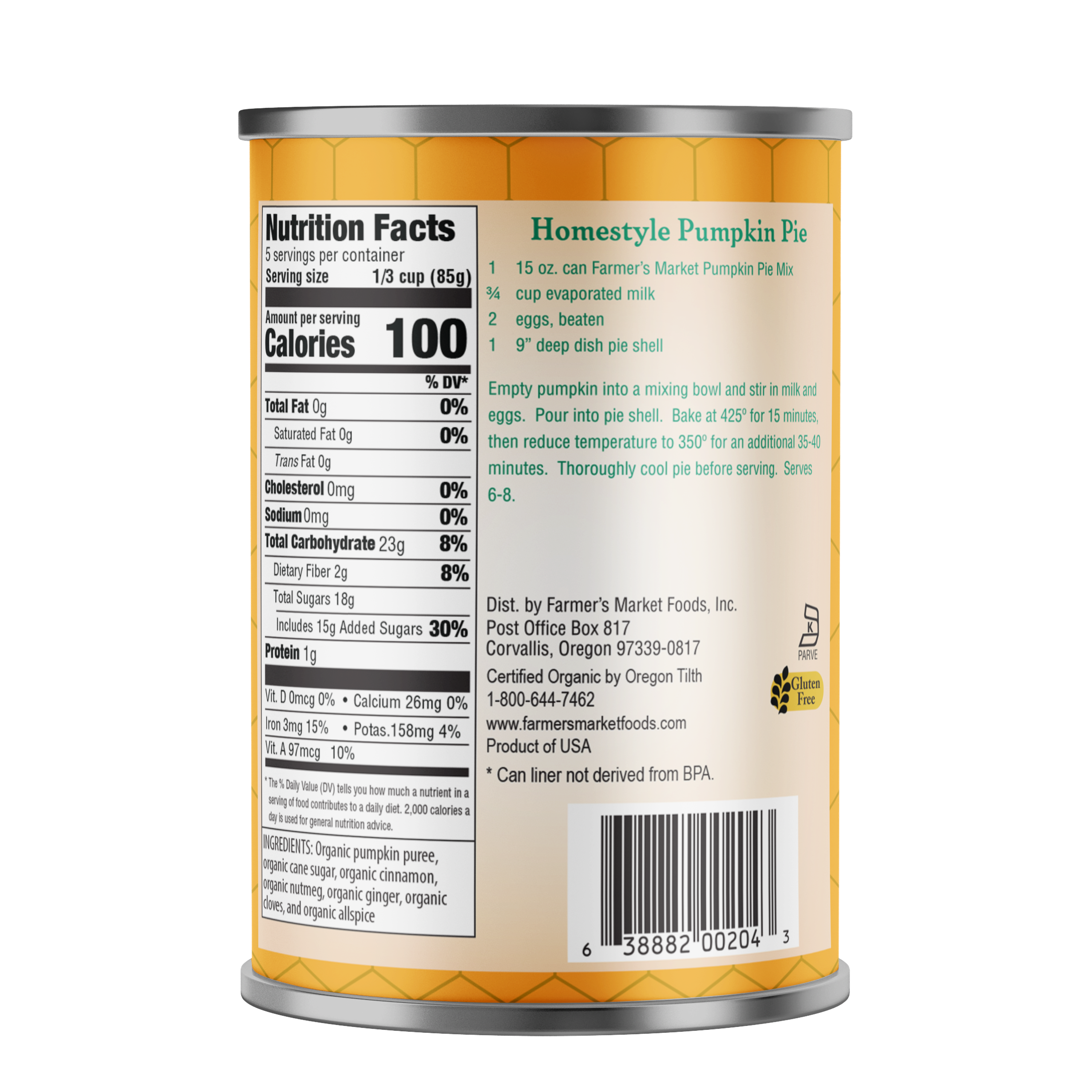 Organic pumpkin pie mix is made with the freshest pumpkin that’s infused with sugar and spices for the perfect pie. Our pumpkin is certified organic, non-GMO verified, gluten-free, grown in the USA and available in BPA-Free lined packaging. For the perfect finish to your favorite meals, add a little Farmer’s Market.