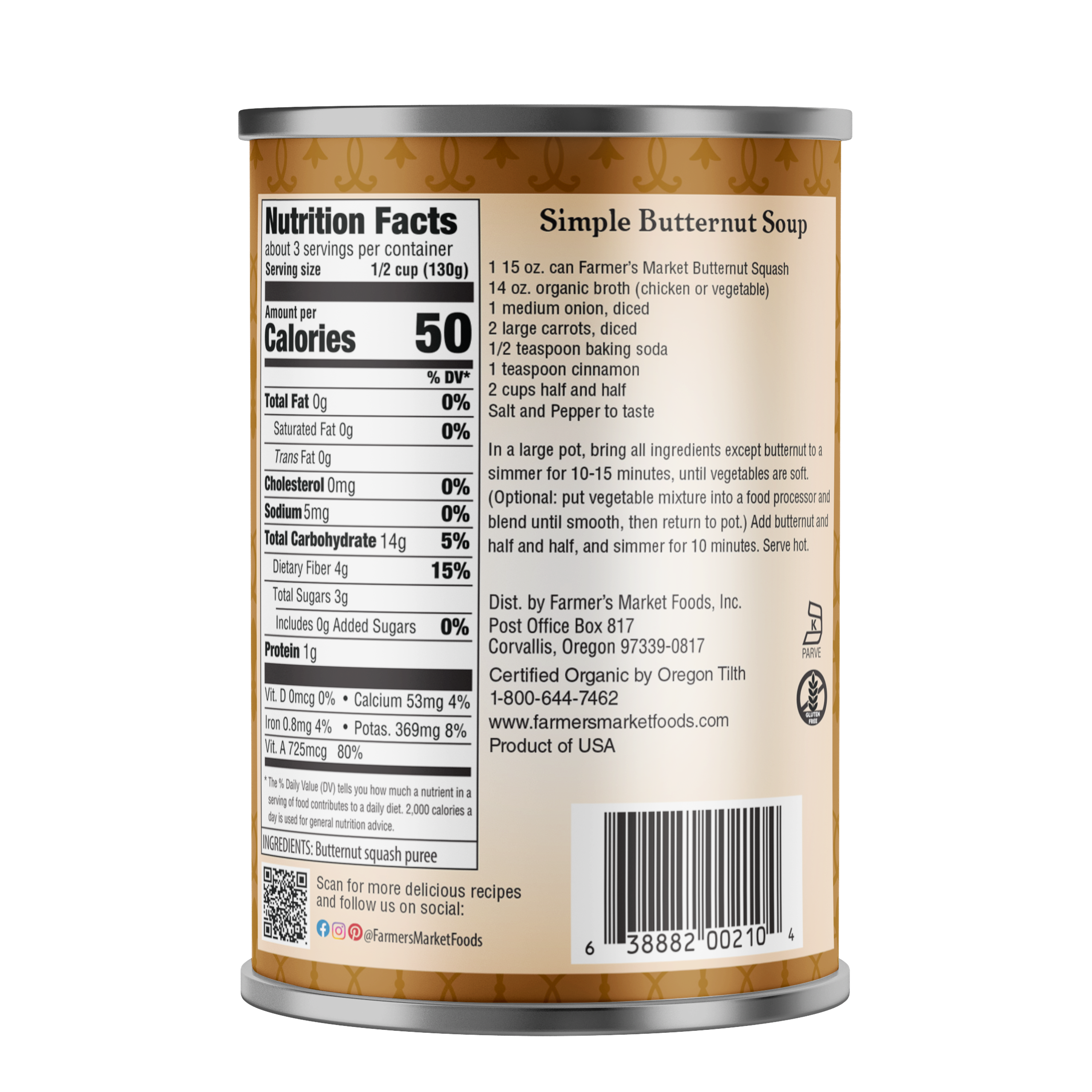 Organic butternut purée with the fresh, pure flavor you’d expect to find at a country produce stand. Our butternut is certified organic, non-GMO verified, gluten-free, grown in the USA and available in BPA-Free lined packaging. For the perfect finish to your favorite meals, add a little Farmer’s Market.